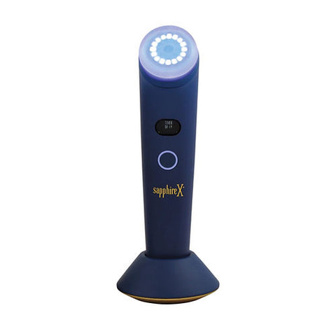 The Sapphire X uses blue light therapy and topical heat to help your skin look clearer and minimize the appearance of blemishes. Sapphire X disinfects, detoxifies and eliminates bacteria under the skin, revealing a smoother and healthier complexion that will help your skin tone to appear more even. The Sapphire X uses blue LEDS in the range of 415 nm. The Sapphire X is an FDA class II medical device.